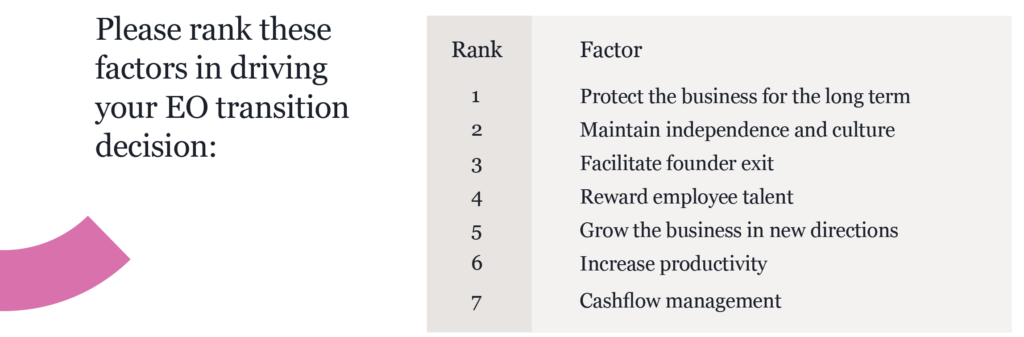 Our Co-Owner and Head of EO, Barry Horner, spoke at the 2024 EOA Annual Conference and during his session, he surveyed a group of around 80 business owners, all of whom were either considering transitioning to an employee ownership scheme, or already had. He asked attendees to rank the factors driving their EO transition decision, and the most popular motivation was to protect the business for the long term. You’ll notice that tax breaks weren’t mentioned at all!